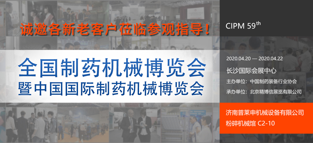 第59屆(2020年春季)全國製藥機械暨中國國際製藥機械博覽會將於2020年04月20日至04月22日在長沙國際會展中心舉行。該博覽會曾連續被中華人民共和國商務部列為重點支持展會之一, 是業界公認的專業化、國際化、規模大、展品全、觀眾多,集貿易、研討於一體的製藥裝備行業交流平台。